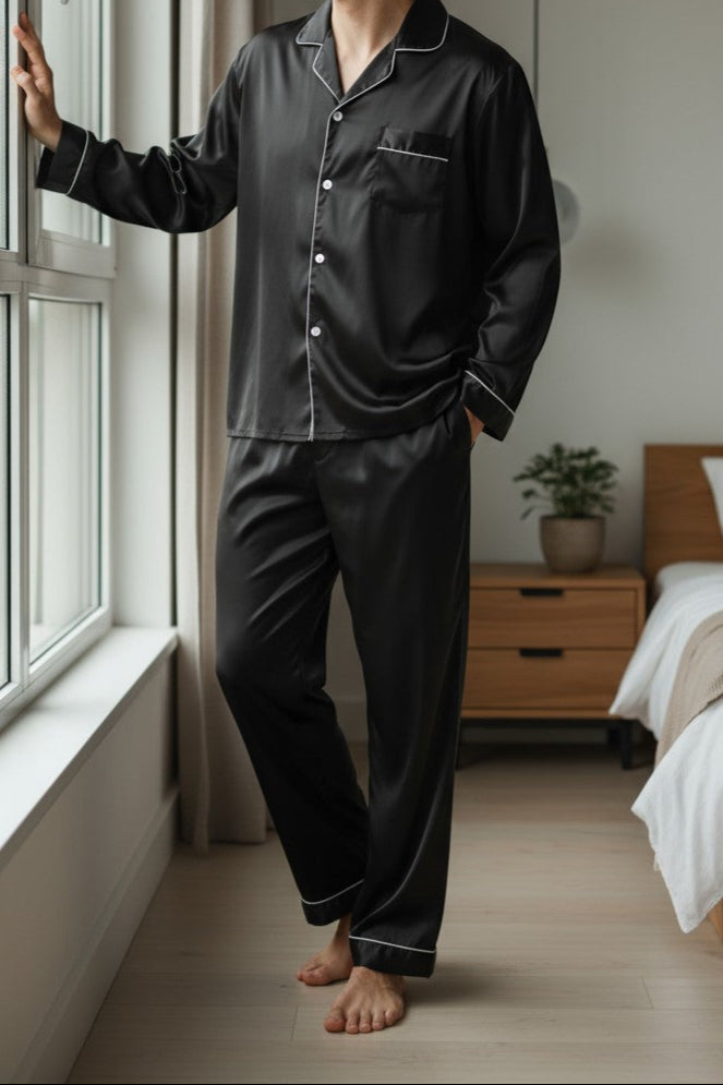 Indulge in the luxury of the season with this women’s cosy silk-touch pyjama set — where festive charm meets timeless elegance. Crafted from smooth, breathable materials, this set feels beautifully soft against the skin, offering comfort that lasts from cosy winter nights to lazy holiday mornings.